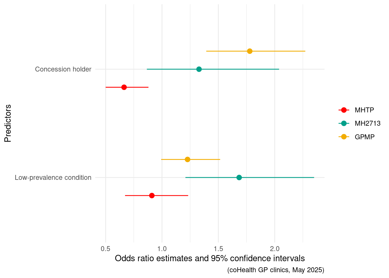 The odds ratio of having been billed a GP mental health treatment plan 'MPTP', GP mental health consultation 'MH2713' or GP chronic disease management plan 'GPMP', according to concession card status and low-vs-high prevalence mental health condition (coHealth GP clinics, May 2025) | |||||||||