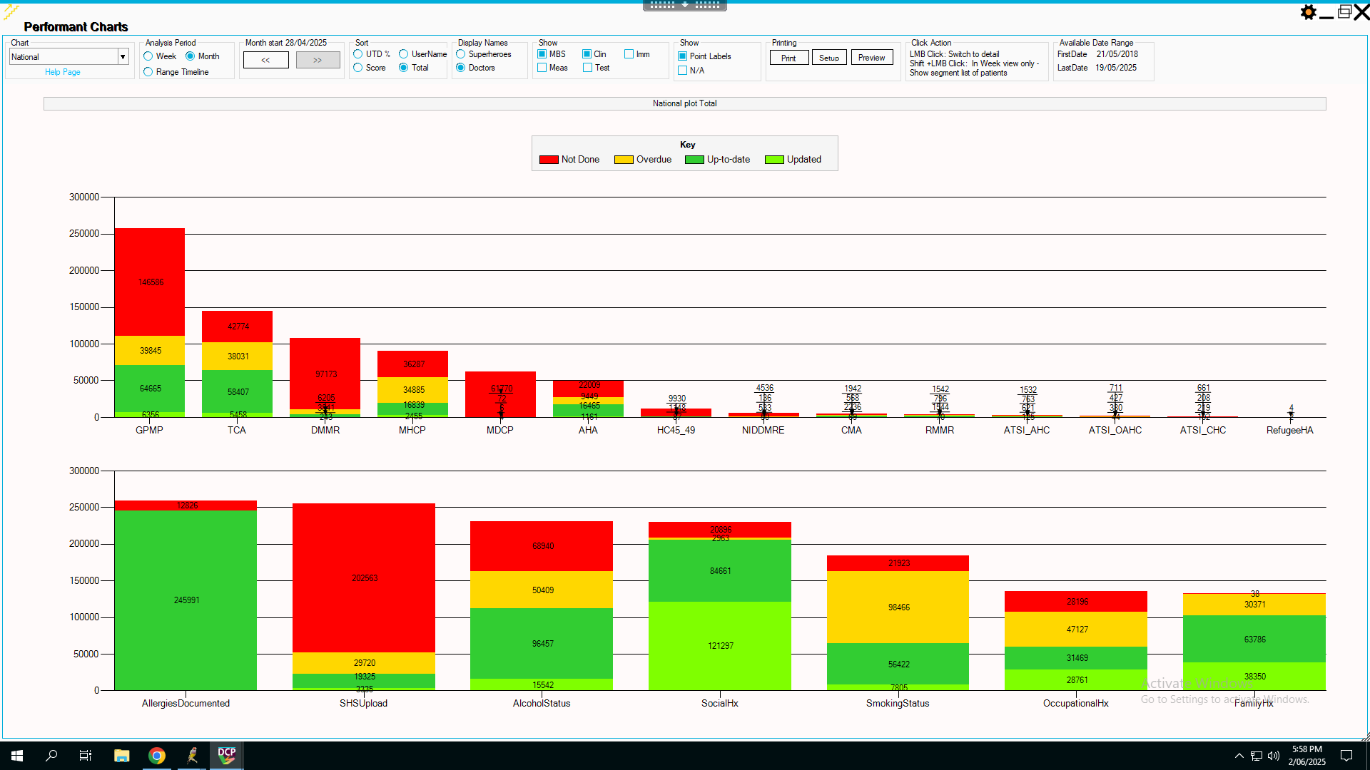 The total number of unique patients seen during that time period can be calculated from the numbers who are expected to have ‘Allergies Documented’, which is all patients seen. For cohealth, the figure is 5557+720 = 6277. For all practices which use Doctor’s Control Panel (‘national’), the figure is 245991+12826 = 258817.